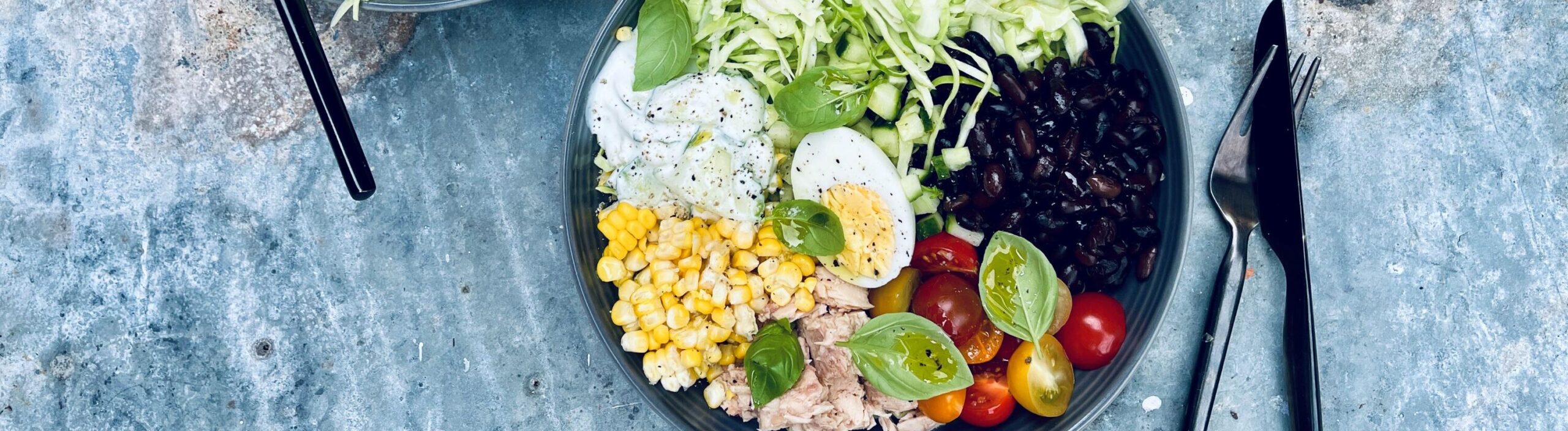 Fordel kål, tun, bønner, halverede æg, majs, tomater og agurk i tern i to skåle samme med tzatziki. Drys med basilikum og dryp lidt olivenolie over.